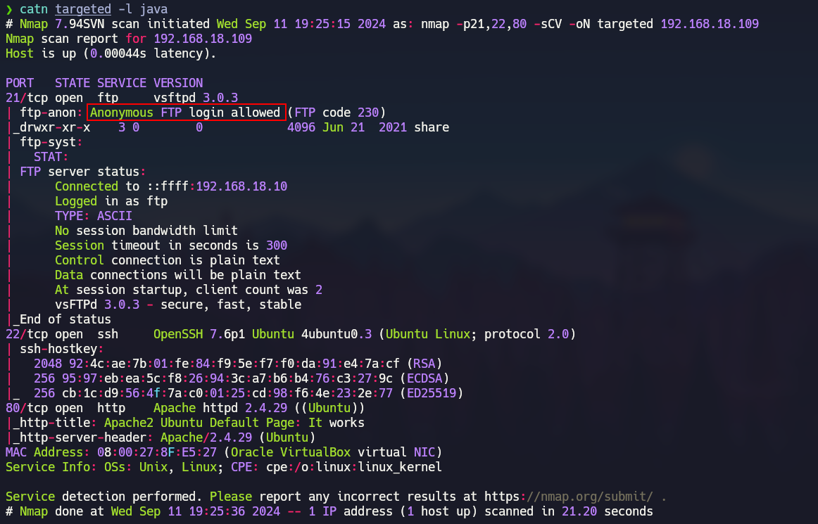 nmap -p21,22,80 -sCV 192.168.18.109 -oN targeted