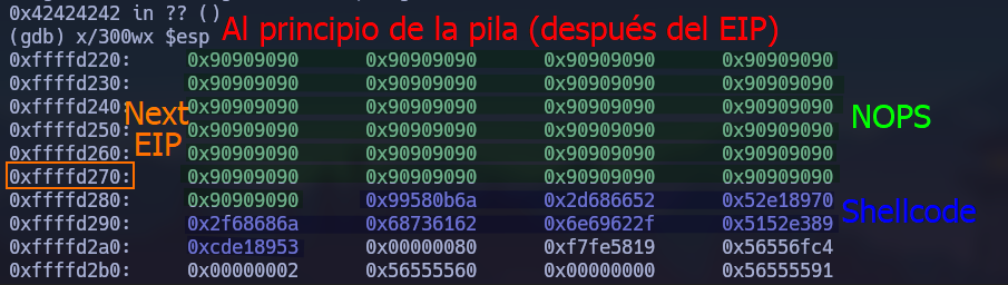 Por lo que ahora lo que haremos será introducir los NOPs seguido de nuestro shellcode y finalmente como EIP introduciremos una dirección de memoria que antes antes de nuestro shellcode y que apunta a los NOPs para que de esta forma el shellcode se ejecute correctamente.