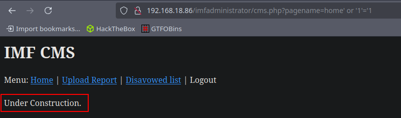 Si la condición es falsa nos muestra un Welcome to the IMF Administration, por lo que tenemos una forma de enumerar la base de datos gracias a una Inyección SQL basada en booleanos.