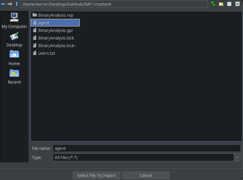 Ahora importaremos el binario agent con File > Import File.