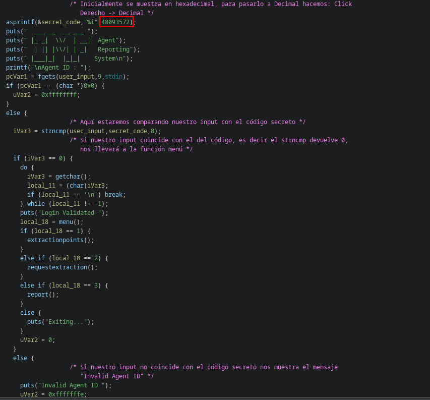 Tras un análisis, llegaremos a la conclusión que nuestro user_input se está comparando con la cadena 48093572, es decir debemos introducir dicha cadena para para que nos muestre el menú,